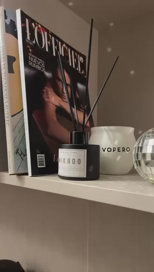 Es un difusor natural que utiliza varillas de ratán, madera o algodón para absorber y liberar fragancias de forma continua y sin electricidad.